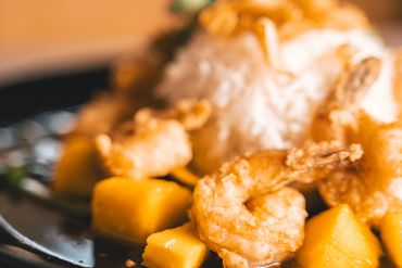 Crispy fried shrimp with sweet chili sauce, chunk mangoes Thai basil, and bell pepper. Served with jasmine white rice in a mango boat and crispy garnish.