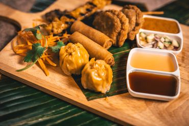 2 each of por pia pak, steamed dumplings, chicken puffs, and satay combo. Add 1/2 hot lovin' for an additional charge. ($1.55)