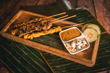 Marinated and grilled chicken, or beef served on skewers with creamy peanut sauce and fresh cucumber relish. Gluten free.